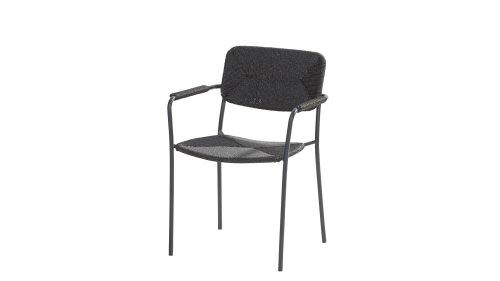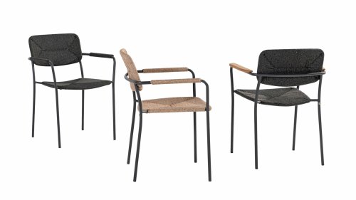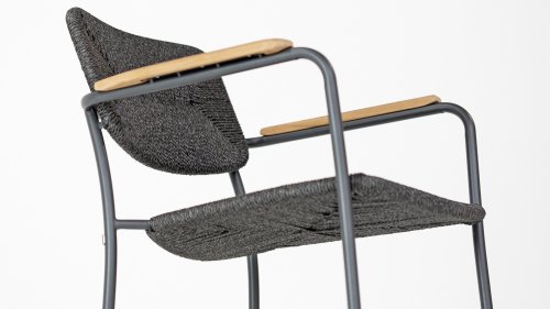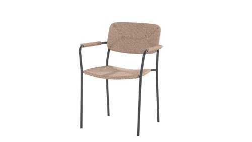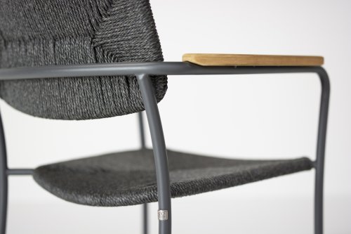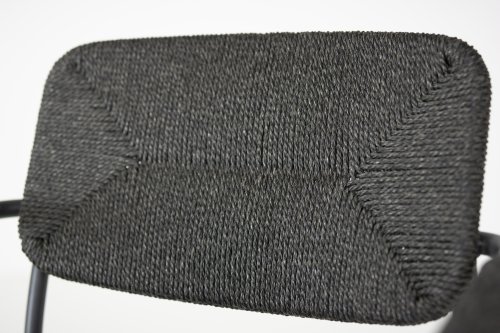 Het antraciet frame van RVS heeft een sterke maar minimale en industriële look door de dunne ronde buizen. De afgeronde hoeken geven het nog steeds wel een vriendelijk karakter. Het materiaal van de Bora stoel is uniek in onze collectie. Het is een gedraaide vlechtwerk-draad. Het geeft de Bora stoel een natuurlijk touw-achtig uiterlijk. Zowel de zitting als de rugleuning is gemaakt van dit materiaal en ook de armleuning zijn omwikkeld met hetzelfde vlechtwerk.