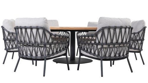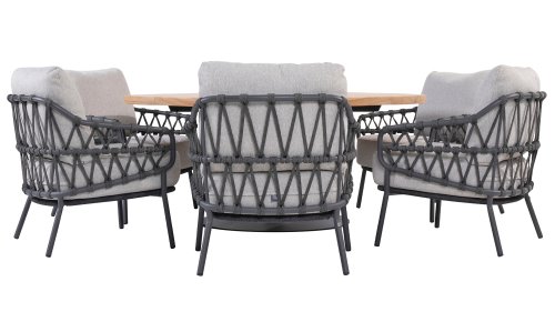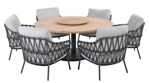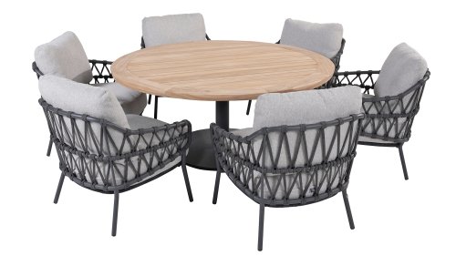 De Saba low dining tafel heeft een gepoedercoat RVS onderstel met een teakhouten tafelblad. Wij adviseren het teakhout te onderhouden met onze onderhoudsmiddelen  van 4 Seasons Outdoor om een lange levensduur en een mooie uitstraling te garanderen. De Calpi stoel bestaat uit een RVS onderstel met rope delen welke bestand zijn tegen verschillende weersinvloeden.