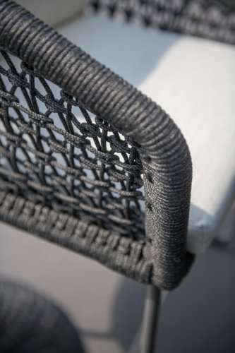 Het 4Seasons Mila frame is omvlochten is met antraciet synthetische wicker in de vorm van touw (Rope). De kussens zijn uitgevoerd in een prachtige grijs kleurige Olefin stof. Door de veerkracht van het Rope materiaal en de heerlijke zit-en rugkussens ontstaat een subliem zit-comfort! De kussens hebben een Olefin hoes welke af te ritsen is en uit te wassen op 30 graden. Deze stof is zeer weerbestendig en duurzaam.