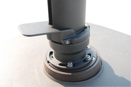 Iedere hangarmparasol van 4Seasons Outdoor kan draaien op de sokkel en naar achteren kantelen om de lage zon op te vangen.