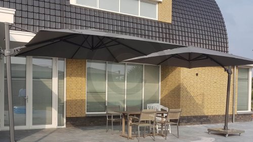 Neemt u wielen erbij, dan is de parasol ook verplaatsbaar op uw terras.