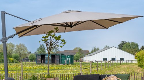 Iedere hangarmparasol van 4Seasons Outdoor kan draaien op de sokkel en naar achteren kantelen om de lage zon op te vangen.