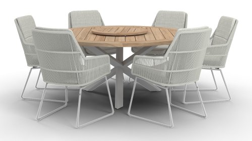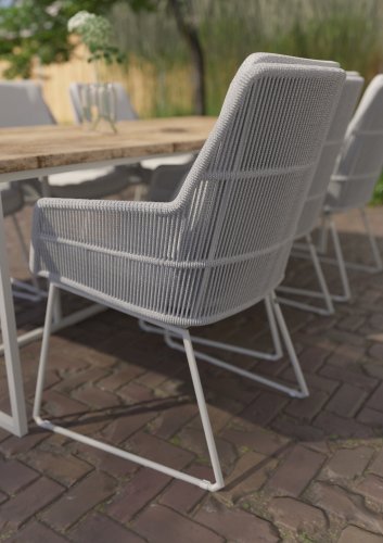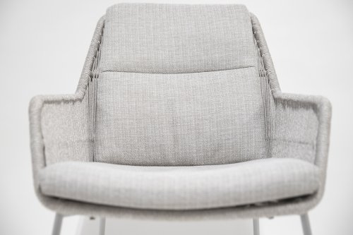Valencia komt van het merk 4 Seasons Outdoor. Het frame is gemaakt van gepoedercoat roestvrij staal. De stoel is voorzien van all weather touwen. Het touw kan altijd buiten blijven staan zonder stof aan te trekken. Staat het kussen niet op de stoel, dan ziet de stoel er prachtig uit. Het zitkussen is licht grijs. Er is olefinestof gebruikt. Dit is een niet-vervagende stof. Deze stof is ook weerbestendig. De 4-seizoenen outdoor eetkamerstoel Valencia is een mooi gevormde stoel. De ronde vorm en het zachte kussen maken het tot een comfortabele stoel. Dit nieuwe product in de 4 Seasons Outdoor-serie is verkrijgbaar in twee kleuren: platinagrijs en Frost Grey. De Valencia tuinstoel zorgt voor een uitstekende ondersteuning van de rugleuning van de stoel, en is perfect te combineren met verschillende eettafels! Het merk 4 Seasons Outdoor produceert producten van de hoogste kwaliteit.