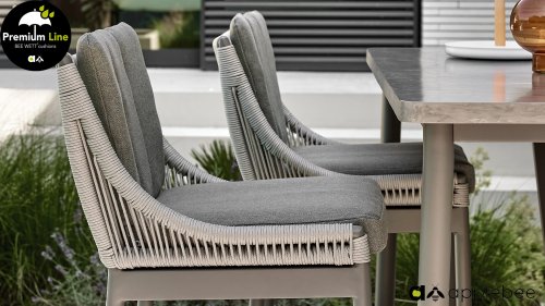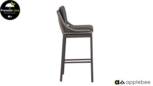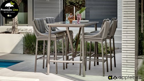 De Bijou barset is van het merk AppleBee. De tuinstoel heeft een moderne uitstraling doordat er gebruik is gemaakt is van Ash Grey rope. De AppleBee Bijou barstoel heeft een sterk frame dat gepoedercoat is in de kleur Taupe. Het frame is met rope afgewerkt in de kleur Ash Grey. Het rope is van all weather materiaal gemaakt en kan dus het gehele jaar buiten blijven staan.