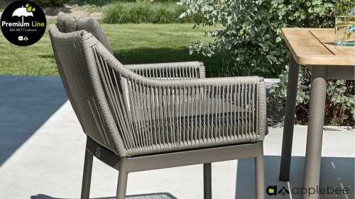 De meisjesnaam Bijou betekent zacht en vriendelijk. Dit gaat zeker op voor de nieuwe parel in de Apple Bee collectie. Het rope van de AppleBee Bijou heeft de uitstraling van wilgenteen. Natuurgetrouw om te zien, maar in de bekende stevige Biculair® buitenkwaliteit die u van Apple Bee gewend bent. Dit rope wordt omlijst door een taupe gepoedercoat frame met gebogen lijnen, waaraan tuinset Bijou haar chique, moderne look ontleent.