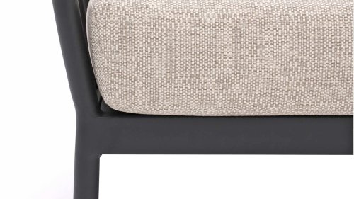 De Applebee Condor Loungeset heeft een strakke, stoere look. Dit is doorgevoerd in zowel de loungestoel en de 2 en 3-zits Loungebanken. Het basismateriaal van de set is matzwart gepoedercoat aluminium, wat is toegepast in robuuste afmetingen. De BEE WETT® kussens hebben een grove weefstructuur, maar dit wel met een soft touch voor het optimale comfort. Samen met de mooie rondingen in de rug en het gebruik van naturel teakhout in het tafelblad en de stoelleuningen, krijgt de Applebee Condor Lounge toch dat aangename vleugje natuurlijke warmte mee.
