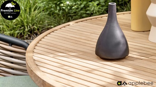Het hout dat door AppleBee gebruikt wordt is FSC® en SVLK® gecertificeerd! Teakhouten tuinmeubelen zorgen voor een prachtige uitstraling. Bovendien is het sterk materiaal en vraagt het weinig onderhoud. Als u uw teakmeubelen buiten laat staan, krijgt het in de loop der jaren een ander uiterlijk. U kunt uw teakhouten tuinmeubelen prima onderhouden met de artikelen uit ons teak onderhoudsmiddelen programma. Daarnaast kunt u teak met groene zeep reinigen. Onregelmatigheden zijn kenmerkend voor het product. Dit soort onregelmatigheden kan daarom ook nooit aanleiding vormen voor reclamatie, garantie of claim. Het betreft een handtekening van originaliteit.