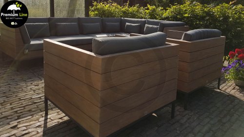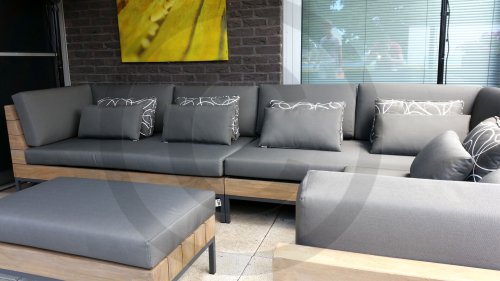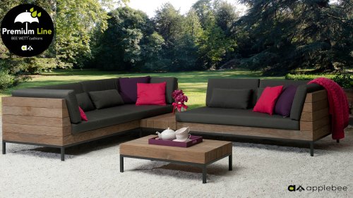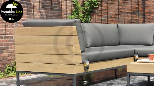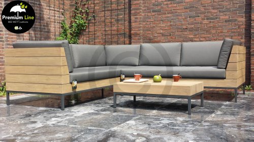Applebee Long Island Loungeset: Robuuste teakhouten balken, samengesmolten tot een stoer en tijdloos loungemeubel. De Applebee Long Island Loungeset blijft zéker niet onopgemerkt in uw tuin of op uw terras, in welke opstelling dan ook! De antique finish die is aangebracht op het teakhout geeft deze set een zeer stijlvol karakter. De smalle kieren tussen de teakhouten latten staan garant voor de mooie strakke lijnen die over het meubel lopen. Het slanke aluminium frame aan de onderkant van de loungeset zorgen voor contrast met de robuuste bovenkant. De donkergrijze Bee Wett kussens maken het geheel af.