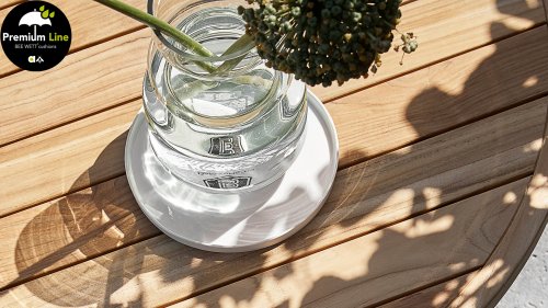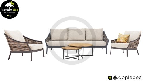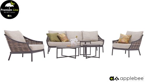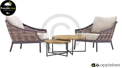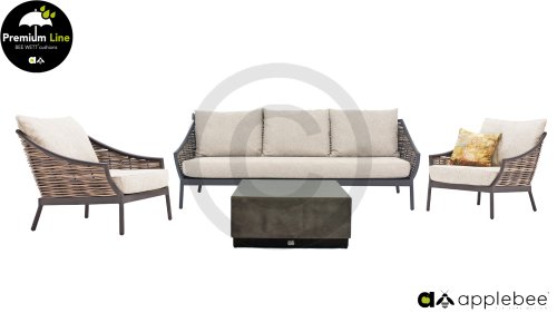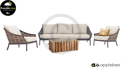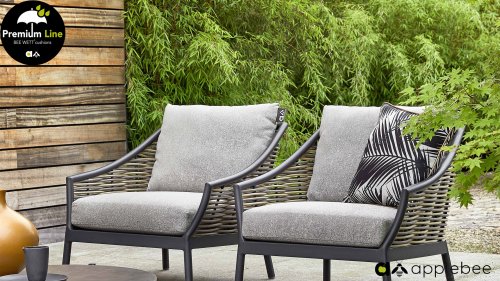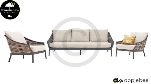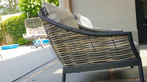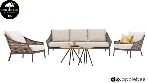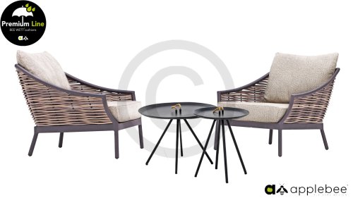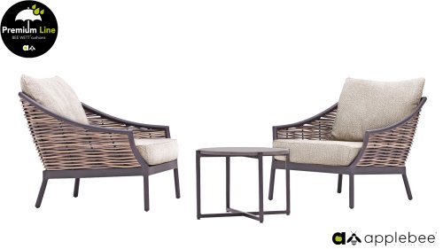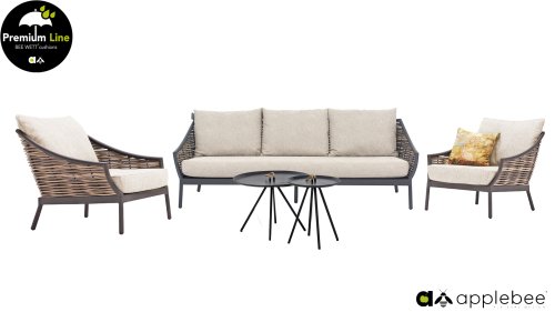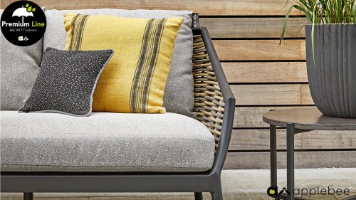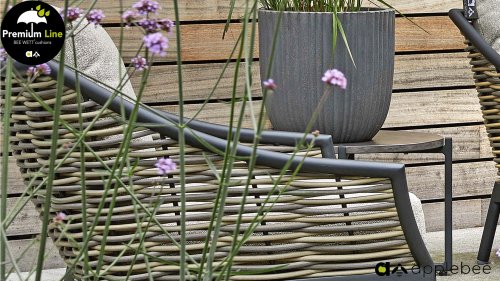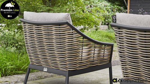 Door het vriendelijke formaat is Applebee Milou Black ook geschikt voor een balkon of kleiner terras. Met Milou is er weer een typisch origineel Apple Bee designmeubel in de collectie bijgekomen! Bij de premium line zijn de kussens voorzien van Bee Wett® technologie, wat ervoor zorgt dat de kussens weer snel droog zijn na een fikse regenbui. U kunt de kussens dus gewoon buiten laten liggen. De drainage aan de onderzijde van het kussen zorgt er namelijk voor dat het water de kussens eenvoudig kan verlaten. In het royale formaat kunt u verdwijnen in luxe en comfort. De Apple bee Milou loungeset zwart is daarmee uitermate geschikt om écht te loungen.Het extreem dikke vlechtdraad vergt een bijzondere vlechttechniek, die alleen de beste vlechters beheersen. Deze ambachtslieden vlechten iedere draad één voor één handmatig in. Je haalt met AppleBee Milou Loungeset Black dus een echt staaltje ambachtskunst in huis.