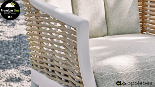 Het uitgesproken succes van de Applebee Milou tuinset Black zorgde voor een grote vraag vanuit de markt naar een bijpassende White dining combinatie. Ontwerper Sako is hiermee aan de slag gegaan en zo ontstond de Applebee Milou White Dining set. De Milou collectie is herkenbaar aan het vlechtwerk, wat bijna gemaakt lijkt van wilgentakken. Bij de premium line zijn de kussens voorzien van Bee Wett® technologie, wat ervoor zorgt dat de kussens weer snel droog zijn na een fikse regenbui. U kunt de kussens dus gewoon buiten laten liggen. De drainage aan de onderzijde van het kussen zorgt er namelijk voor dat het water de kussens eenvoudig kan verlaten. Het extreem dikke vlechtdraad vergt een bijzondere vlechttechniek, die alleen de beste vlechters beheersen. Deze ambachtslieden vlechten iedere draad één voor één handmatig in. U haalt met AppleBee Milou tuinset dus een echt staaltje ambachtskunst in huis. Prachtige combinatie met een teakhouten tafel!