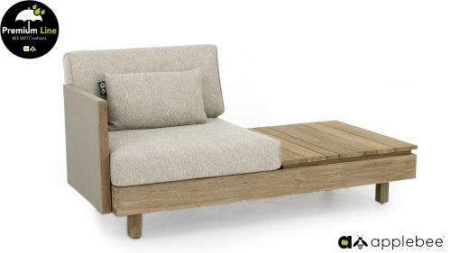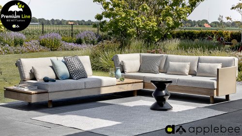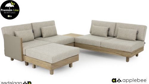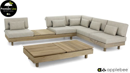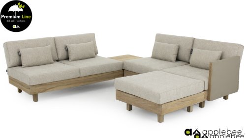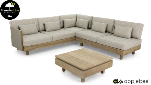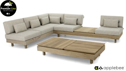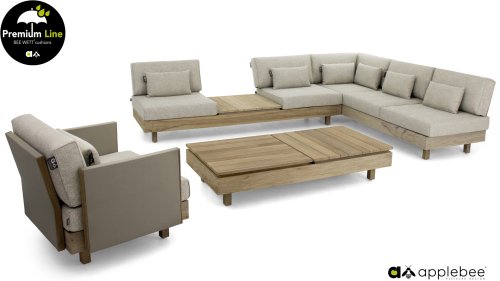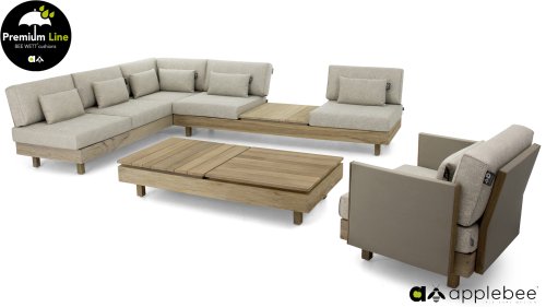 Applebee Module-X Loungeset Coastal: Flexibiliteit zonder grenzen. Met de Applebee Module-X kunt u eindeloos variëren in de opstelling en meubelen. Alle losse onderdelen vormen samen het loungemeubel, waarmee u uw eigen tuin designed! En volgende week creëert u weer wat anders. Het hout dat gebruikt wordt is FSC® en SVLK® gecertificeerd. Natuurlijk met de bekende Nature Grey Beewett kussens van AppleBee voor heerlijk gebruiks gemak! Apple Bee meubelen worden opgebouwd uit de beste materialen. Dit geldt zeker voor de kussens. BEE WETT zijn speciale weerbestendige kussens. De afneembare hoes wordt gemaakt van de best mogelijke stoffen die alle wasbaar zijn.