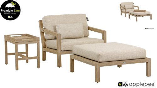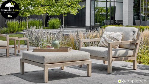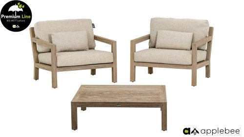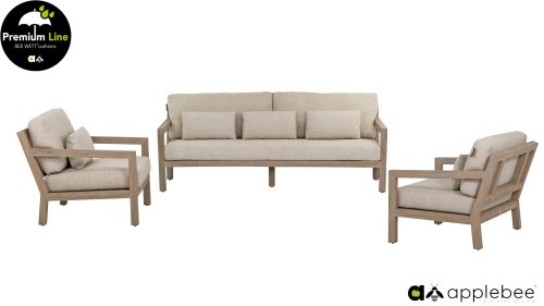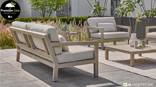 Het hout dat gebruikt wordt is FSC® en SVLK® gecertificeerd. Natuurlijk met de bekende Natural Oak Beewett kussens van AppleBee voor heerlijk gebruiks gemak! AppleBee meubelen worden opgebouwd uit de beste materialen. Dit geldt zeker voor de kussens. BEE WETT zijn speciale weerbestendige kussens. De afneembare hoes wordt gemaakt van de best mogelijke stoffen die alle wasbaar zijn.