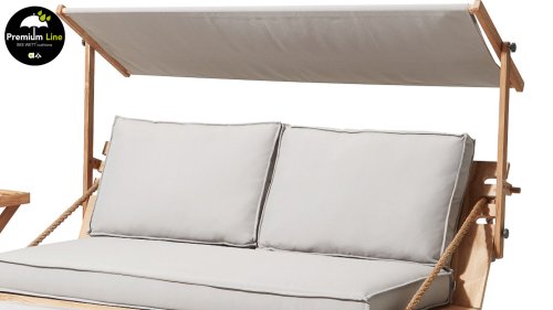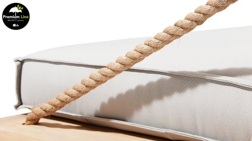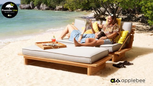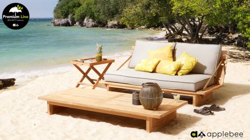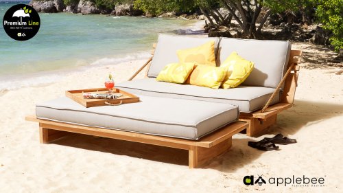 olledig gemaakt van natural smooth teak introduceert Apple Bee met grote trots haar nieuwste meesterwerk genaamd Robinson. Waan jezelf op een onbewoond eiland en droom weg op jouw Robinson daybed, geniet van een drankje in de lounge opstelling of laat je voeten lekker rusten op de footstool. In een oogwenk transformeer je de love seat met koffietafel of footstool, naar een luxueus daybed. Bescherm je ogen tegen de zon door een zonnescherm bovenop de Robinson te plaatsen. Stel naar eigen inzicht de rugleuning in op 1 van de 3 verschillende standen, met behulp van een mooi ogend sluitsysteem van sterk touw.