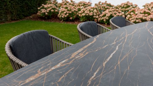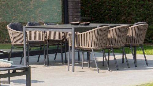Castle Line Clavo Dining: Aluminium poten, stevig van kwaliteit en erg onderhoudsvriendelijk. Met rope draad in de kleur taupe en het onderstel in antraciete kleur, geeft deze serie een mooie uitstraling. Castle Line is het tuinmeubelmerk dat innoveert. Dat blijkt ook uit de Clavo tuinstoel. Deze is namelijk gemaakt van touw. Het touw is vervolgens gevlochten door en om een aluminium frame. Het touw van de Castle Line Clavo zorgt voor een open structuur en zorgt daarmee voor ruimtelijkheid. Ook zorgt het touw ervoor dat je een echte vintage loungebank hebt.
