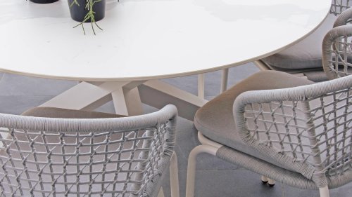 Less is more, binnen onze Rysa Dining serie zijn de tuinmeubelen minimalistisch maar landelijk vormgegeven met vooral functionele eenvoud en sierlijke vormgeving. De prachtige frames zijn gemaakt van aluminium voor optimale weerbestendigheid. Het onderstel is fragiel gevormd maar oersterk, in fris wit ( Ice ) kleur gepoedercoat aluminium. Hetwelk gecombineerd wordt met het prachtige Light Grey kleurige gevlochten rope, geeft een moderne maar toch "warme" uitstraling. De ronde vormen houden dit design helemaal in balans.