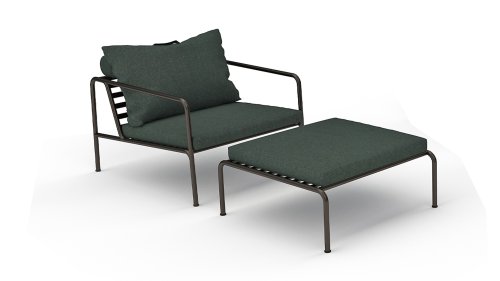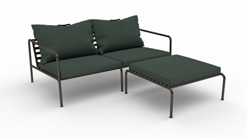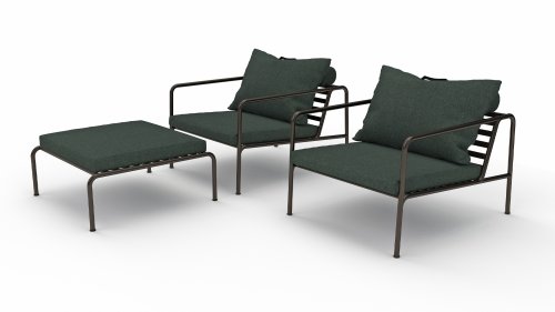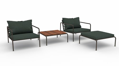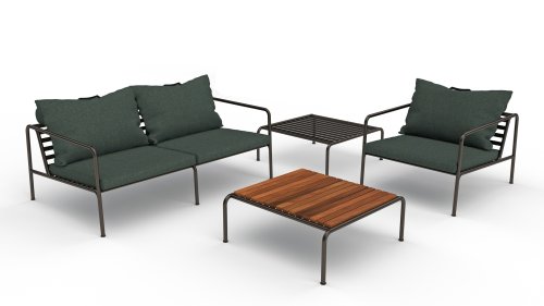 De AVON lounge collectie van Houe bestaat uit een 2-zits bank, een loungestoel en een poef met kussens in Sunbrella Heritage-stof en een loungetafel onderstel, welke kan met of zonder tafelblad in thermo essen worden gebruikt. De frames zijn gemaakt van gepoedercoat zwart staal.