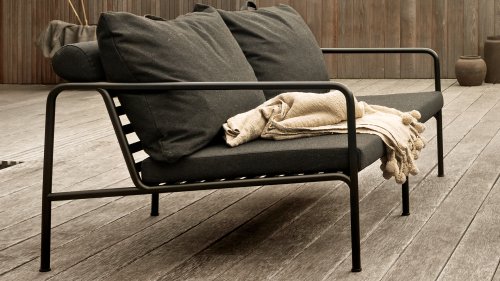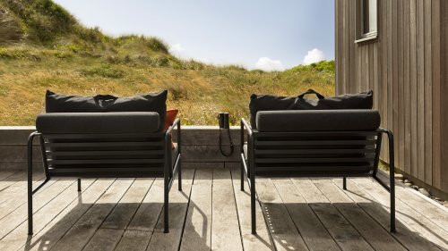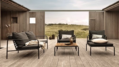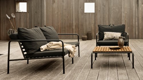 De AVON lounge collectie van Houe bestaat uit een 2-zits bank, een loungestoel en een poef met kussens in Sunbrella Heritage-stof en een loungetafel onderstel, welke kan met of zonder tafelblad in thermo essen worden gebruikt. De frames zijn gemaakt van gepoedercoat zwart staal.