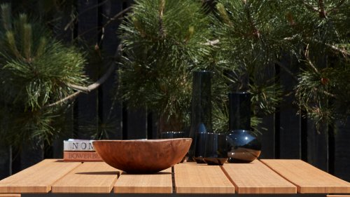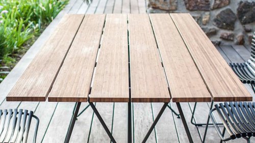 Houe sketch tuintafel met een bamboe blad. Deze prachtige minimalistische tuintafel van het Deense design merk Houe komt in 2 lengtes: 160cm en 210cm. Het onderstel is gemaakt van staal in combinatie met een speciale poedercoating, wat de tafel geschikt maakt om buiten te plaatsen. Deze tafel past perfect bij de Click dining tuinstoelen van Houe, het frame is dezelfde kleur als het frame van de stoelen. Doordat Bamboe veel sneller groeit is het een duurzaam alternatief voor teakhout. Bamboe dient 2-3 keer per jaar geolied te worden, dan behoud het zijn mooie warme kleur.