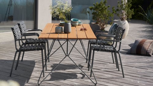 Houe sketch tuintafel met een bamboe blad. Deze prachtige minimalistische tuintafel van het Deense design merk Houe komt in 2 lengtes: 160cm en 210cm. Het onderstel is gemaakt van staal in combinatie met een speciale poedercoating, wat de tafel geschikt maakt om buiten te plaatsen. Deze tafel past ook perfect bij de Click dining tuinstoelen van Houe, het frame is dezelfde kleur als het frame van de stoelen. Doordat Bamboe veel sneller groeit is het een duurzaam alternatief voor teakhout. Bamboe dient 2-3 keer per jaar geolied te worden, dan behoud het zijn mooie warme kleur.