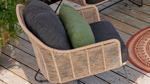 De sterke stof is bestand tegen een regenbui, uitritsbaar en wasbaar. Handig, maar let wel: de kussens zijn waterafstotend. Laat je ze lang in de regen liggen, dan kunnen ze alsnog nat worden aan de binnenkant.