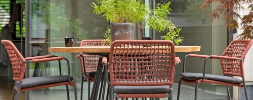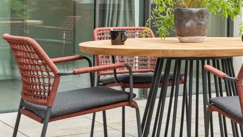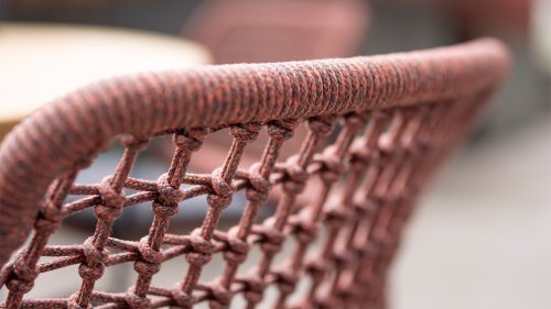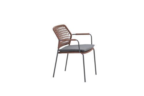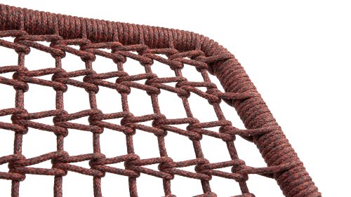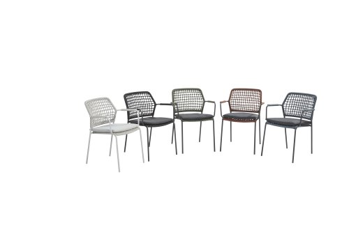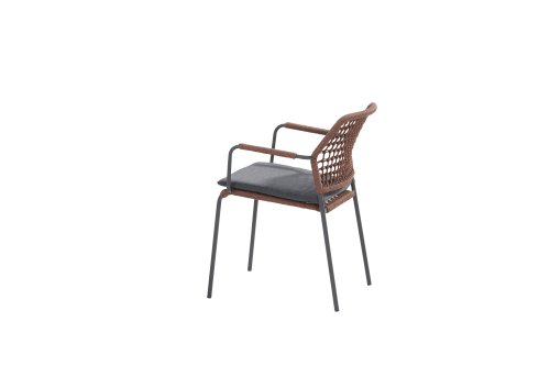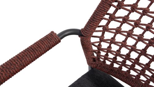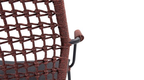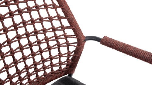 Deze stoel is er in 5 kleuren rope: Antraciet, Groen, Blauw, Frozen en Terra Cotta. Je kijkt hier naar de terra cotta variant. Je kunt dus kiezen welke kleur het beste past op je terras, of je maakt een mooie combinatie van 2 of zelfs 5 kleuren. Het rope materiaal is weerbestendig en in een blok-patroon geknoopt. Het rope komt op subtiele wijze weer terug in de armleuningen.