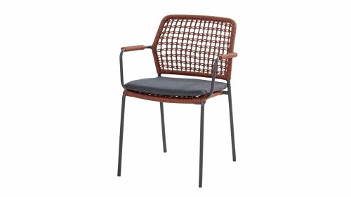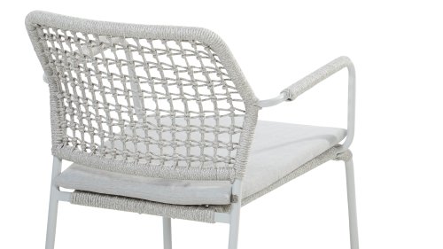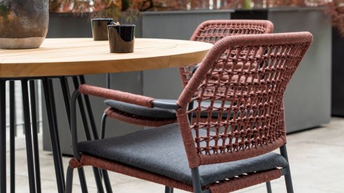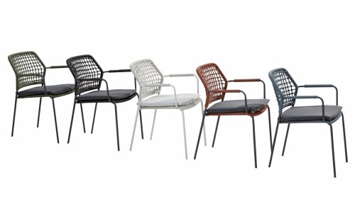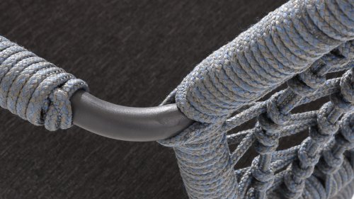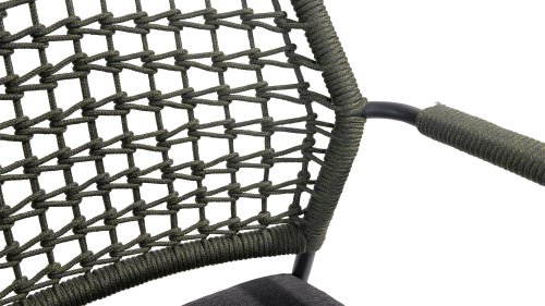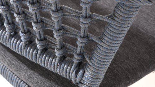 Deze stoel is er in 5 kleuren rope: Antraciet, Groen, Blauw, Frozen en Terra Cotta. Je kijkt hier naar de blauwe variant. Je kunt dus kiezen welke kleur het beste past op je terras, of je maakt een mooie combinatie van 2 of zelfs 5 kleuren. Het rope materiaal is weerbestendig en in een blok-patroon geknoopt. Het rope komt op subtiele wijze weer terug in de armleuningen.