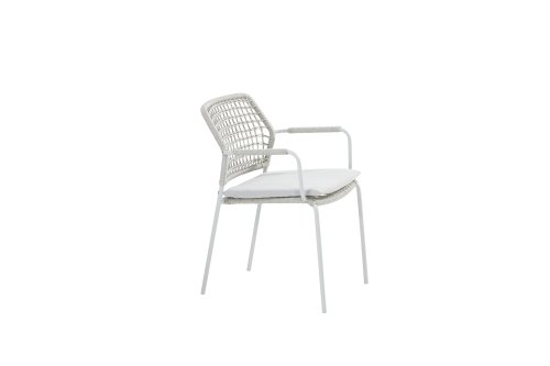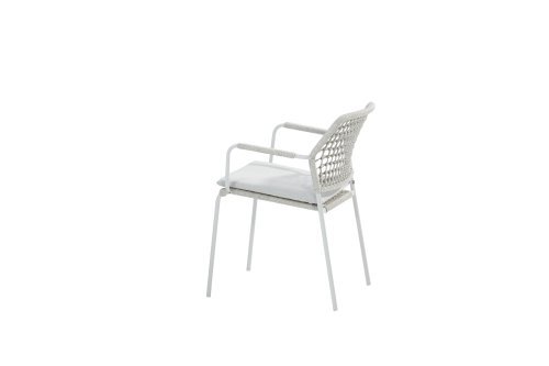 Taste 4Seasons Barista Dining: full of Flavour! De stapelbare Barista tuinstoel is een echte alleskunner, heerlijk comfort en zeer praktisch en het ziet er ook nog eens leuk uit. Combineert zeer goed bij meerdere soorten tafels. Deze stoel is er in 5 kleuren rope: Antraciet, Groen, Blauw, Frozen en Terra Cotta. Je kijkt hier naar de Frozen variant. Je kunt dus kiezen welke kleur het beste past op je terras, of je maakt een mooie combinatie van 2 of zelfs 5 kleuren. Het rope materiaal is weerbestendig en in een blok-patroon geknoopt. Het rope komt op subtiele wijze weer terug in de armleuningen.