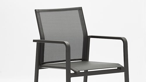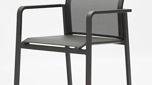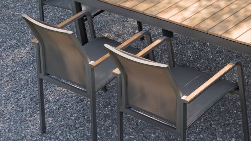 De Zebra Greenline Bee tuinstoel stapelbaar serie. Het frame van gepoedercoat aluminium Graphite Bee Stapelstoel is bedekt met een Carbon Grey gekleurde Batyline® stof. De Bee stapelstoel White heeft een Light Grey zitting. De Batyline® Textilene dat is gebruikt, is een bewezen synthetische stof die is ademend en scheurvast is voor meerdere jaren. De serie Greenline van Zebra combineert onder andere hedendaagse, ecologie en duurzaamheid met elkaar. In de corporate-concept Greenline is de kwestie van duurzaamheid en de selectie van milieuvriendelijke materialen, die worden verwerkt tot comfortabele, fraai vormgegeven, tijdloze meubels. De Zebra Bee tuinstoel is een prachtige comfortable stoel met teakhouten armleuningen. Deze armleuningen hebben een Natural Finish wat mooi "matcht" met de Bee en Mikado tafel.