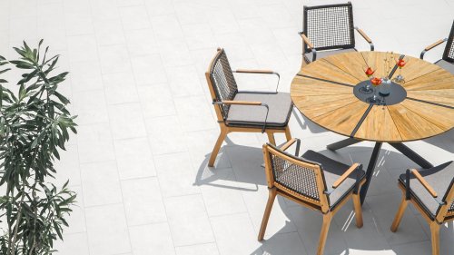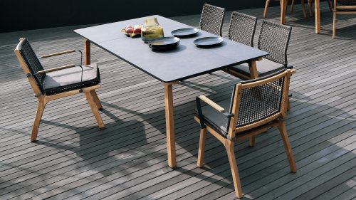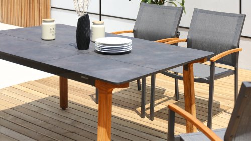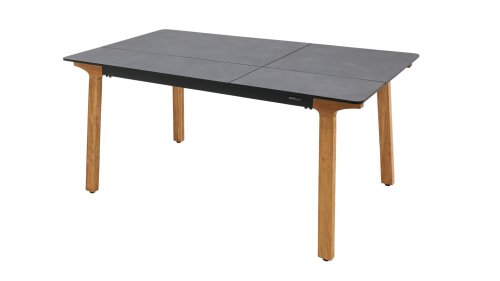 Lenyx is de naam van de nieuwe serie in de ZEBRA pure collectie. Slim gecombineerde, levendige contrasten van kleuren en materialen komen bij Lenyx samen met een klassieke Scandinavische designbenadering. Het rechthoekige tafelblad met een lengte van 160 centimeter of optioneel 220 centimeter bestaat uit HPL in de kleur “vulkanische steen” en biedt plaats aan 6 of 8 personen. Het tafelblad met een slank silhouet en afgeronde hoeken wordt ondersteund door vier schuine tafelpoten van geborsteld teakhout.