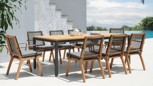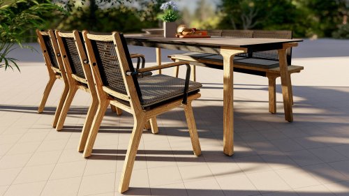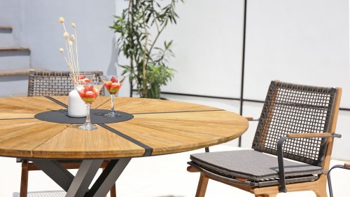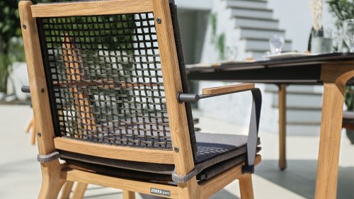 Het harmonieuze en tegelijkertijd contrasterende kleurenspel van de tafel Lenyx is ook terug te vinden in de bijpassende zitmeubels van de serie: een frame van gepoedercoat aluminium in "grafiet" gevlochten met touwstof in "bruin-geborsteld" vormt de zitting en rugleuning, die is gemaakt door één stevig frame van geborsteld teak. Filigrane armleuningen van gepoedercoat aluminium en teak zien er elegant en onopvallend uit. De 3-zits bank uit de serie ZEBRA pure Lenyx is gemaakt van geborsteld teak. De zitting en rugleuning van touwstof vormen een eenheid en worden op de bank geplaatst voor nog meer comfort.