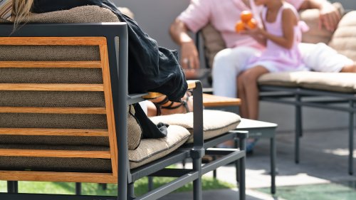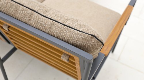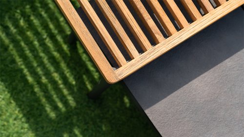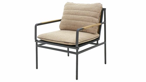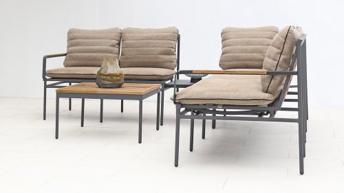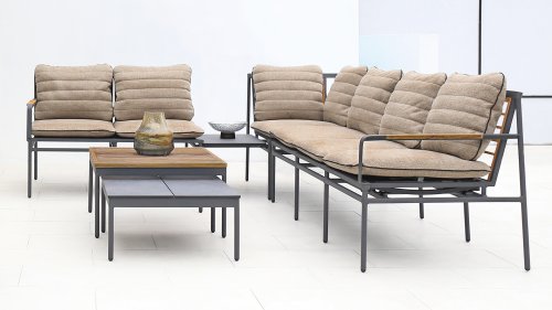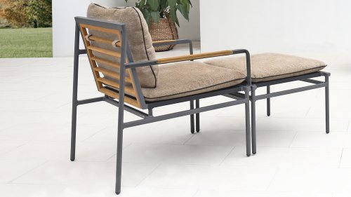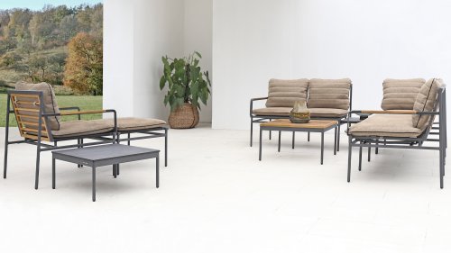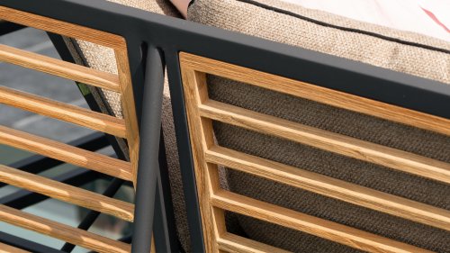 De nieuwe Max Lounge van Zebra maakt indruk met filigrane lijnen en een combinatie van materialen die accenten zet. Het frame van gepoedercoat aluminium in een donkere grijstint ("grafiet") oogt licht en vormt samen met de rugleuning en armleuningen van gerecycled teakhout een perfect contrast.