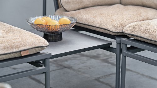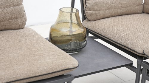 Zittingen van hoogwaardig textiel en bijpassende zitkussens van waterdichte Sunny Guard-stof in de kleur "macchiato" zien er gezellig uit en nodigen uit om te blijven hangen. De nieuwe Zebra greenline lounge bestaat uit verschillende elementen die naar believen met elkaar gecombineerd kunnen worden. De selectie van elementen varieert van 3-zits, 2-zits of fauteuil tot de Max Lounge hoek, een kruk en het Max Lounge verbindingsblad. De gezellige lounge MAX is optioneel ook te combineren met twee verschillende maten salontafels of een eettafel. De eettafel "grafiet" aluminium met een breedte van 140 centimeter biedt voldoende ruimte om comfortabel zittend te kunnen dineren.
