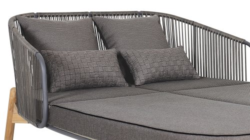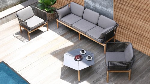 De nieuwe Pollux Lounge van Zebra tovert elke tuin om tot een stijlvolle openluchtwoonkamer. Met zijn eigen karakter maakt het een duidelijk statement en is het een van de eerste producten van het nieuwe ZEBRA-label "ZEBRA pure". Pollux kenmerkt zich door heldere vormen en maakt indruk met eersteklas materialen en unieke kwaliteit. Een frame van gepoedercoat aluminium in "grafiet" kleur, gevlochten met hoogwaardig touw (Rope) samen met de de zit- en rugkussens van hoogwaardige, waterdichte Sunny Guard-stof en het onderstel van geborsteld teakhout zorgen voor een harmonieus geheel.