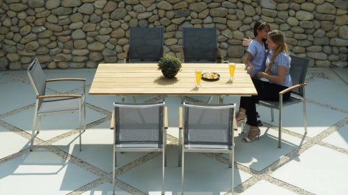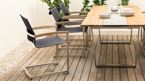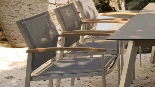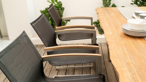 Zebra Setax Dining Chair is tijdloos en gemakkelijk te combineren. De Zebra Setax brengt optimaal zitcomfort en gebruiksgemak. Met de teakhouten armleuning als stijlvol accent. Deze Zebra Setax is er in meerdere uitvoeringen, waarvan één met een iets hogere rugleuning als gebruikelijk. De Zebra Setax tuinstoel is een stapelbaar serie. Het frame van geborsteld roestvrij staal is bedekt met een gekleurd textilenen stof. Stel uw tuinset samen, afhankelijk van uw behoeften. Of u nu kiest voor een kleine houten tafel of een grote RVS tafel, de Setax stapelstoel is geschikt voor elke gelegenheid.U kunt u eenvoudig de stoelen op elkaar stapelen of u laat ze natuurlijk om de tafel staan. Deze RVS stapelstoel Setax van Zebra is niet alleen een ergonomisch geperfectioneerde stoel, maar overtuigt ook door het minimalistische ontwerp en fijne teakhouten armleggers. Ook is er natuurlijk van de Setax dining stoel een swing variant leverbaar.